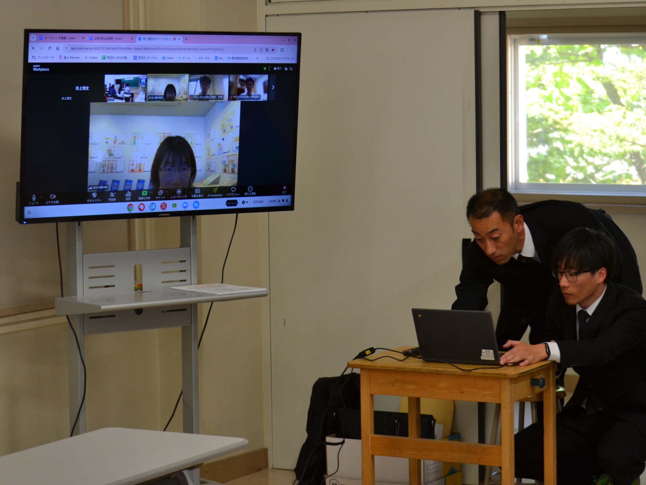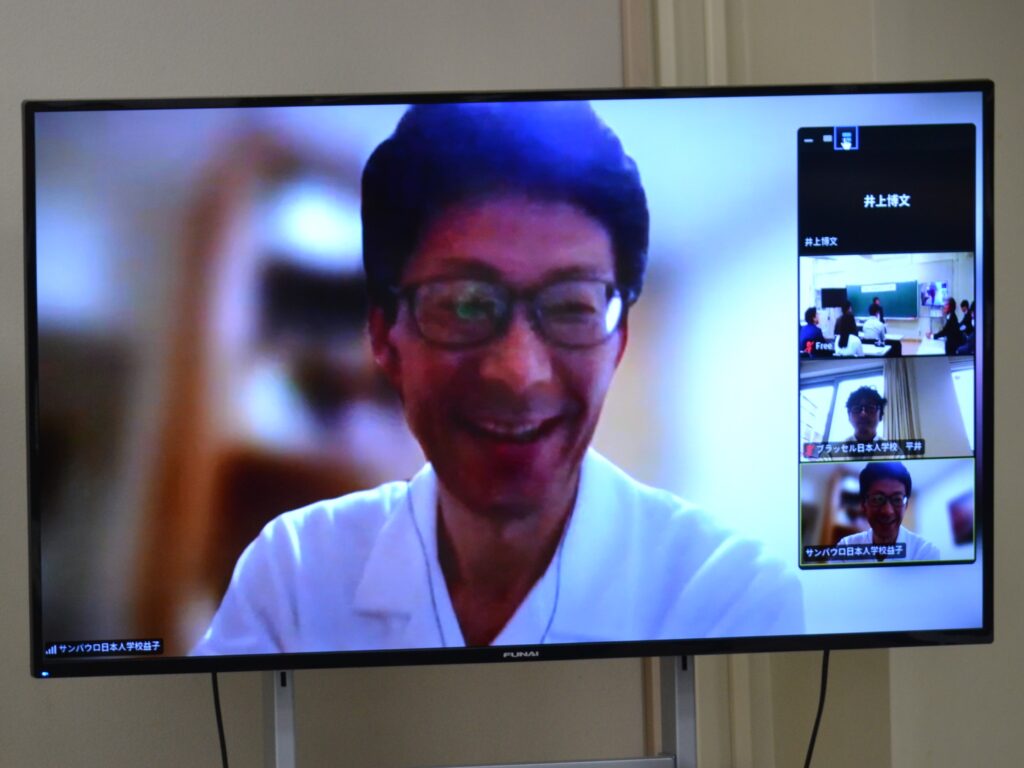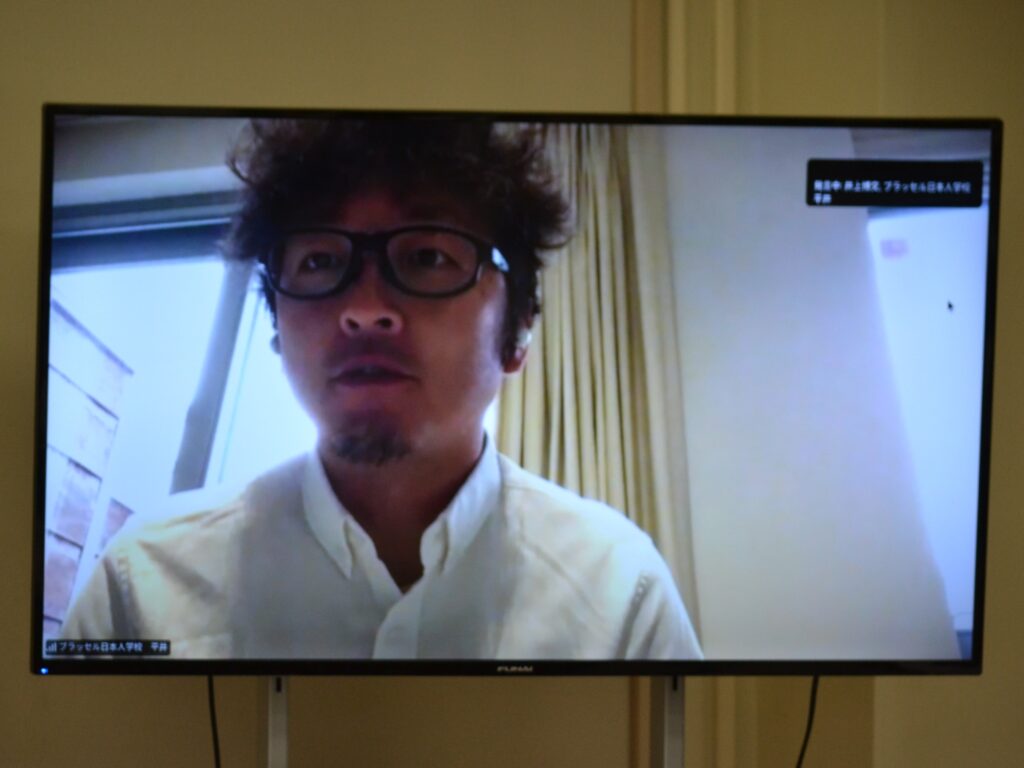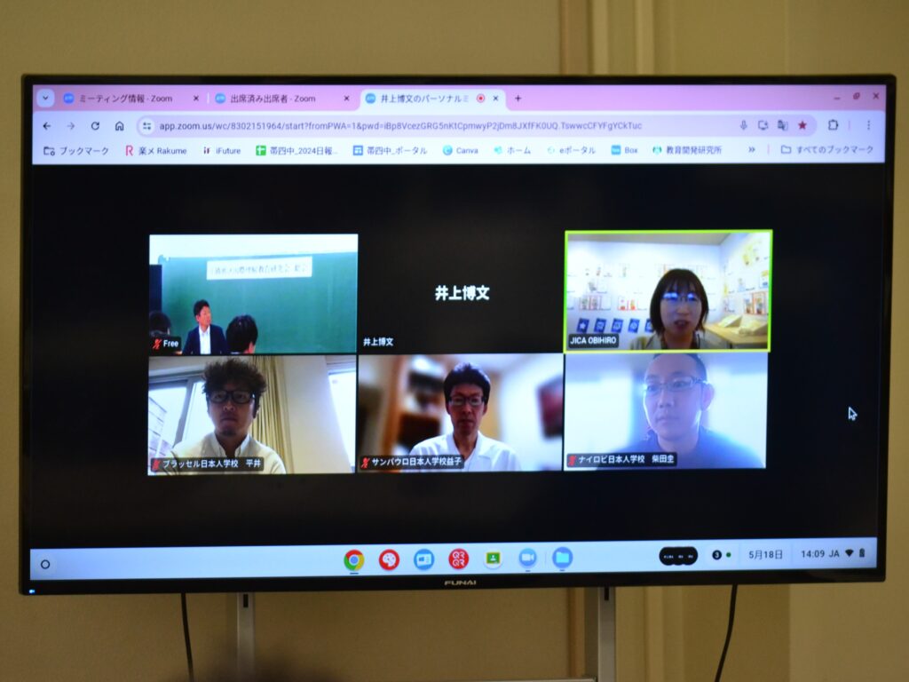 「在外教育施設派遣中会員の紹介」では、ベルギー・ブラッセル日本人学校・平井先生から現地時間朝7:00に自宅から参加していただき、ベルギーの住宅内やバルコニーからの景色も見せていただきました。次にケニア・ナイロビ日本人学校・柴田先生からのお話で、中学部は1~3年生が1クラスの複式で、毎年入学式、卒業式、修学旅行等全ての行事があり、ご自身のお子さんの担任でもあるという日本ではなかなかない状況を伝えていただきました。最後はブラジル・サンパウロ日本人学校・益子教頭先生からのお話で、日本から見て地球の裏側のブラジルは時差が12時間あるので、現地時間は夜中の2時過ぎ!少々テンションが高めな益子教頭先生の笑いを誘う興味深いお話しで、和やかな時間となりました。ブラジルは、女性や老人にやさしい国だと教えていただきました。