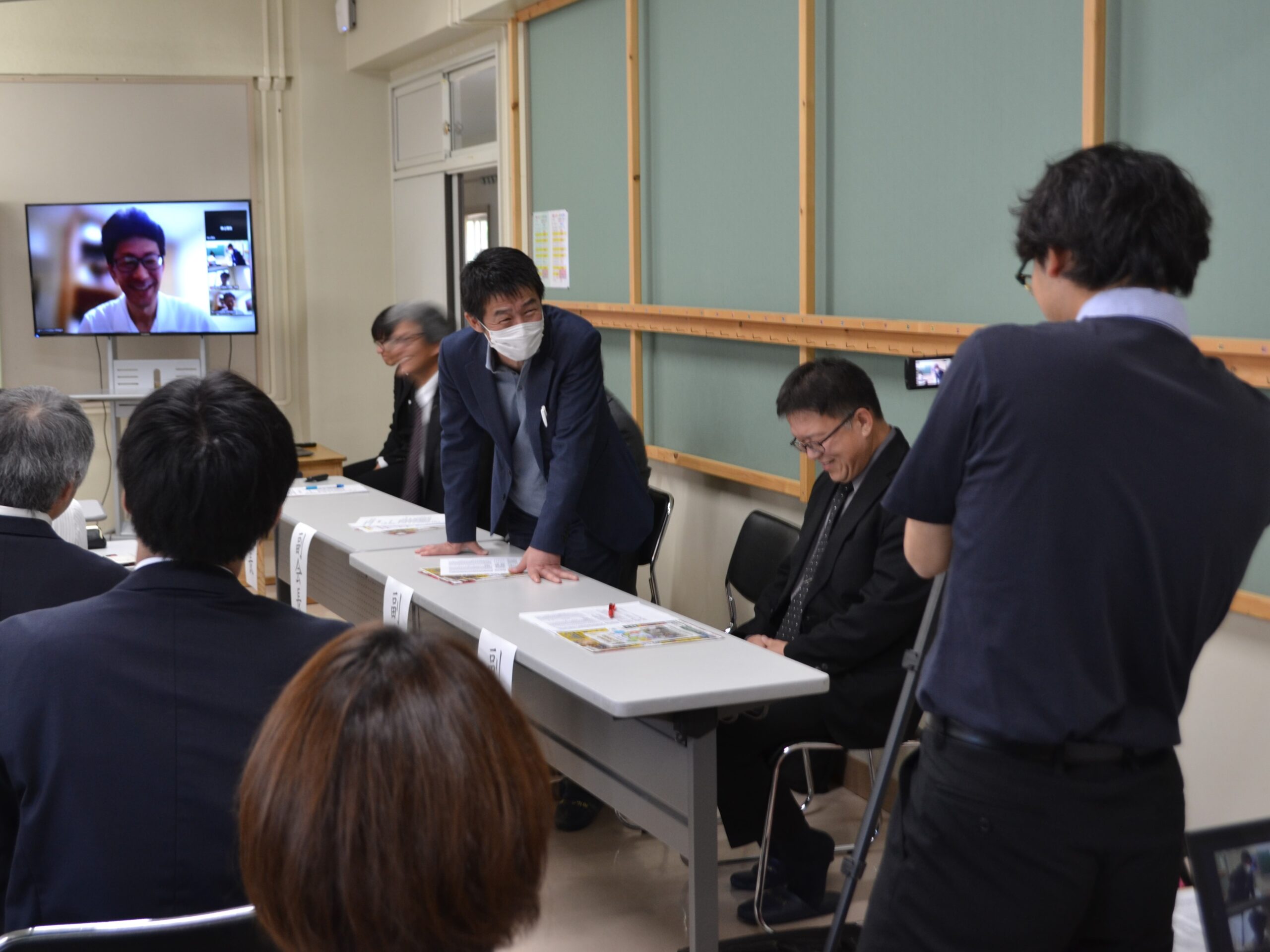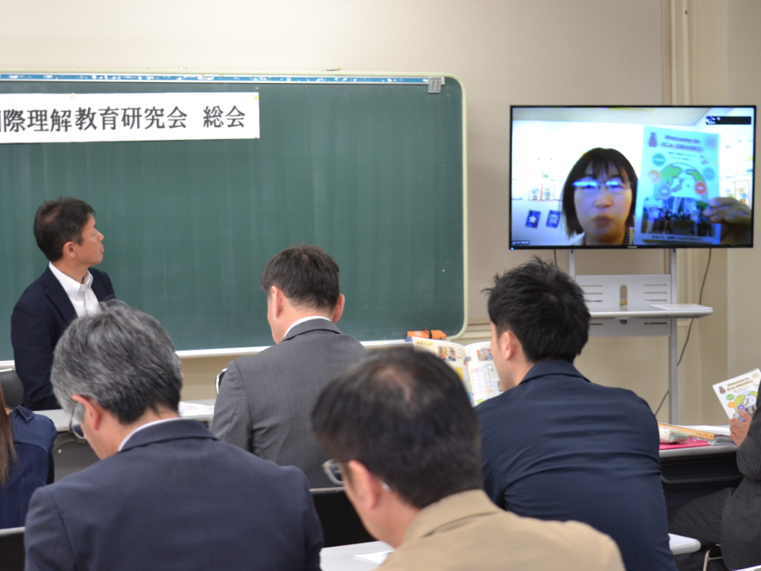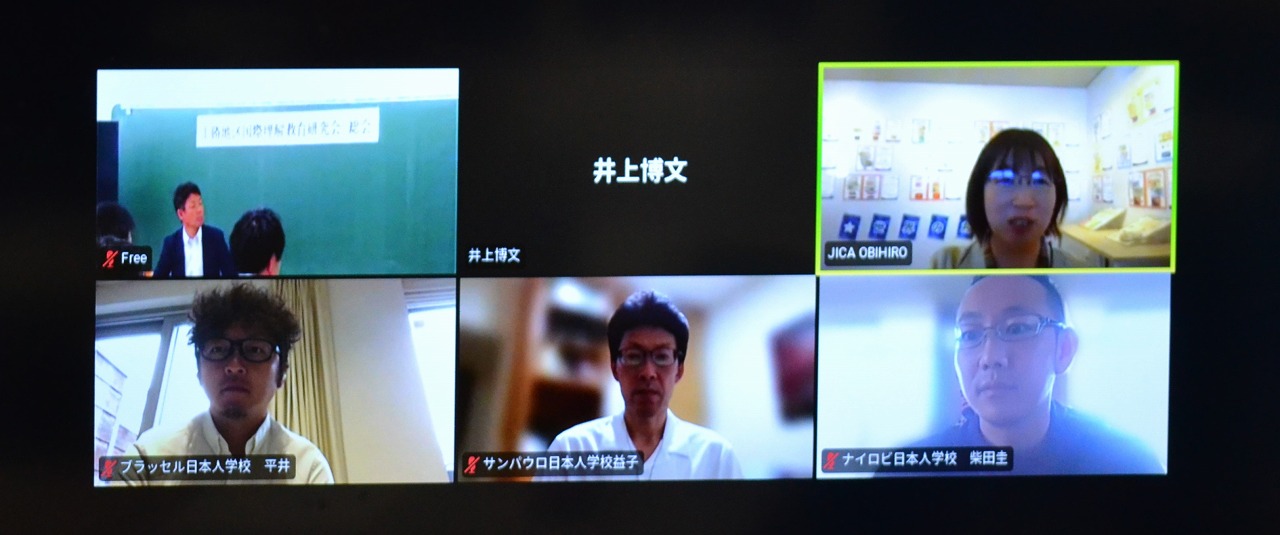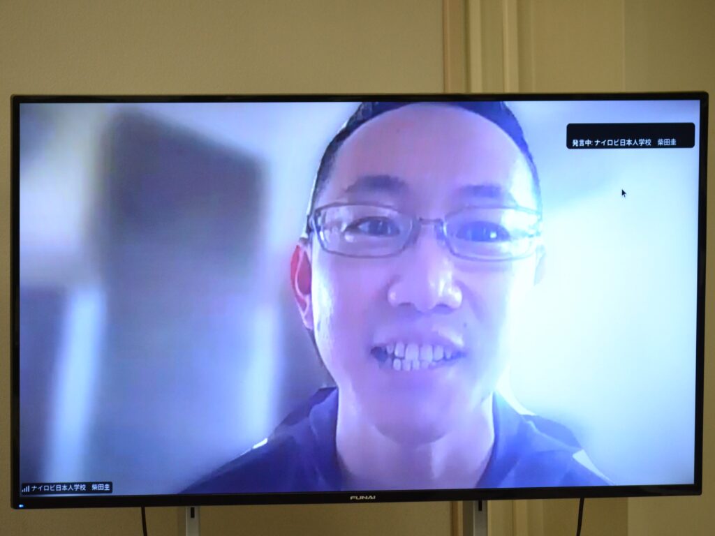 JICA北海道・帯広の野々垣真実様にオンラインでご挨拶をいただき、定期総会が始まりました。この総会には、在外教育施設に派遣中の会員の先生方にもオンラインで参加していただき、まさに国際会議となりました。
