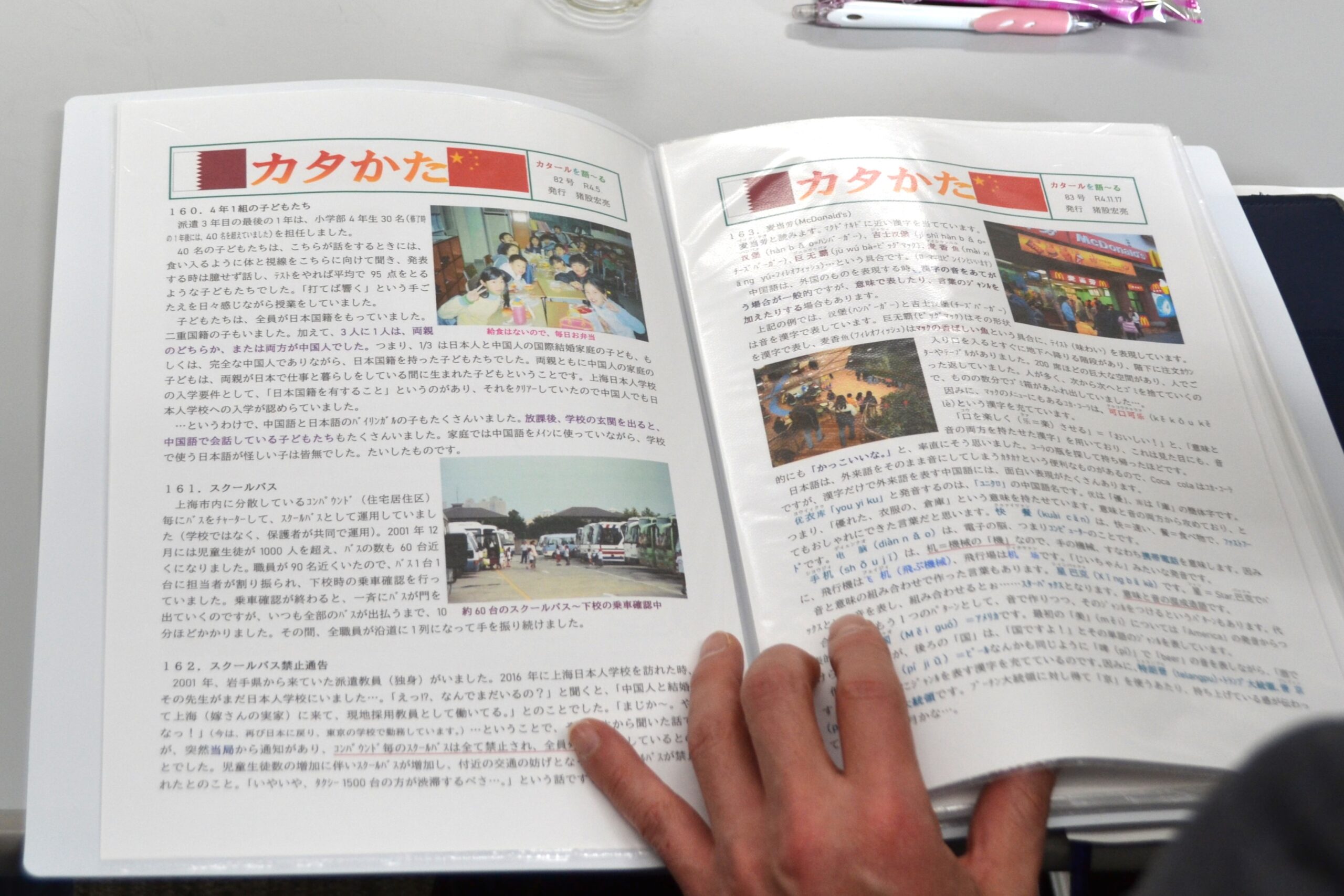 次に、猪俣校長先生からドーハ日本人学校と上海日本人学校での経験をお話ししていただきました。在外教育施設派遣任期の中で2校の日本人学校を経験するという貴重な派遣だったようです。1校目はカタールのドーハ日本人学校で、日常生活は暑さとの戦いだったようです。中東は石油資源が豊富で日本には資源がないように思われるが、日本は人が資源、教育が資源だとお話ししていただきました。2校目の上海日本人学校では現地語がわからず、週2回言葉の勉強をしたそうです。やはりコミュニケーションを図るためには言葉が大切です。これらの経験は、カタールを語~るを略して「カタかた」という全352号の通信を作って子どもたちに伝えているそうです。