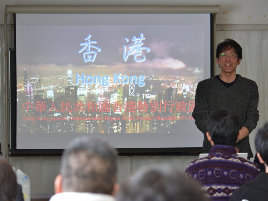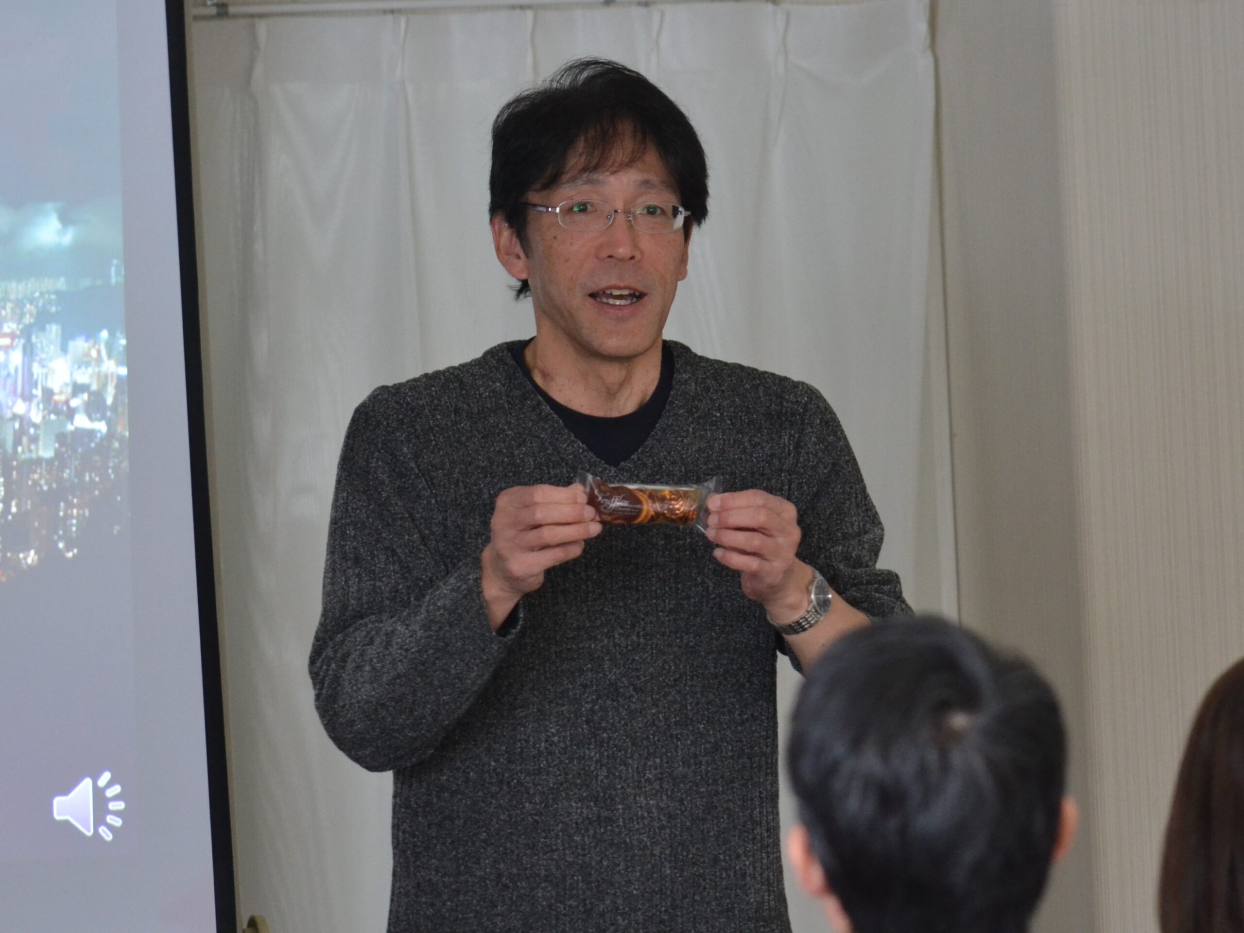 次に川上裕明校長先生の香港日本人学校中学部での経験を聞かせていただきました。まずは派遣当時の世の中はどのような様子だったかを写真や曲で思い出し、クイズ形式で香港の様子を紹介していただきました。有名人の意外なエピソードや蛇が美味しいお話し等、巧みな話術で会場全体をクイズ番組のように盛り上げ、正答数の多い先生には景品も用意し、参加者全員にチョコレートが配られました。